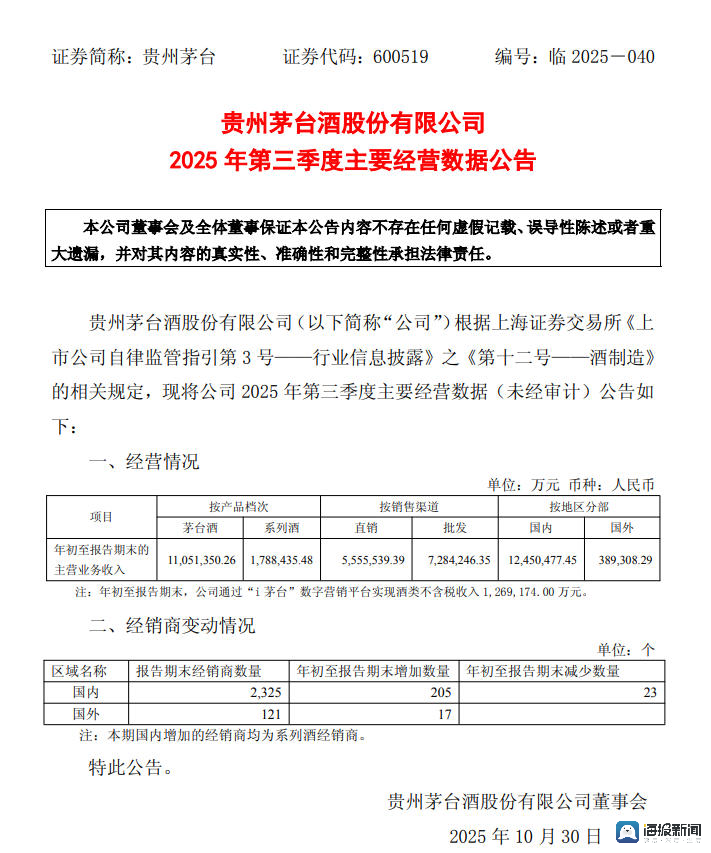 高端(duan)酒(jiu)板塊(kuai)雖仍保持正增長,但增速已(yi)顯(xian)著承(cheng)壓,結束此前高增長態勢。貴(gui)州(zhou)(zhou)茅臺作(zuo)為行業龍(long)頭展現出相對韌性,10月29日(ri),貴(gui)州(zhou)(zhou)茅臺酒(jiu)股份(fen)有限(xian)公司(以下簡稱“貴(gui)州(zhou)(zhou)茅臺”)發(fa)布第三季(ji)度報告,2025年1月至(zhi)9月公司實現營業總收(shou)入(ru)1309.04億元(yuan),同(tong)比(bi)(bi)增長6.32%,利潤(run)總額為894.03億元(yuan),同(tong)比(bi)(bi)增長6.37%;歸母凈利潤(run)為646.26億元(yuan),同(tong)比(bi)(bi)增長6.25%。