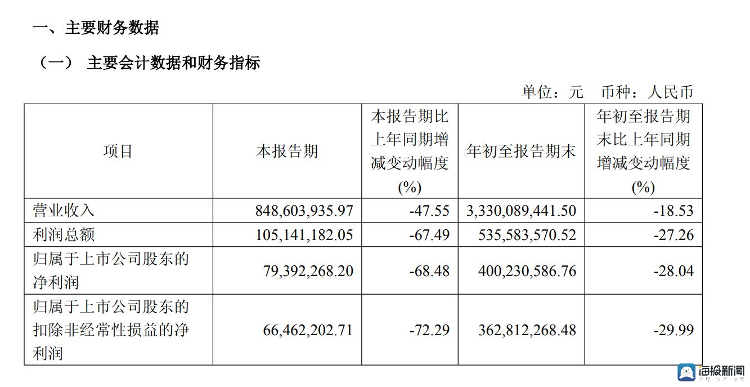 老白(bai)干酒表現(xian)同(tong)(tong)(tong)(tong)樣疲軟,前三季(ji)度(du)實現(xian)營(ying)業收入33.30億(yi)元,同(tong)(tong)(tong)(tong)比(bi)下降(jiang)(jiang)18.53%;歸(gui)(gui)母凈(jing)利(li)潤(run)為4億(yi)元,同(tong)(tong)(tong)(tong)比(bi)下降(jiang)(jiang)28.04%;扣非歸(gui)(gui)母凈(jing)利(li)潤(run)為3.63億(yi)元,同(tong)(tong)(tong)(tong)比(bi)下降(jiang)(jiang)30%。第三季(ji)度(du)營(ying)業收入為8.49億(yi)元,同(tong)(tong)(tong)(tong)比(bi)下降(jiang)(jiang)47.55%;歸(gui)(gui)屬于上市(shi)公司股東(dong)的凈(jing)利(li)潤(run)為7939.23萬元,同(tong)(tong)(tong)(tong)比(bi)下降(jiang)(jiang)68.48%。公司坦言(yan)業績下滑主因是消費需求較(jiao)弱、出庫減(jian)少。