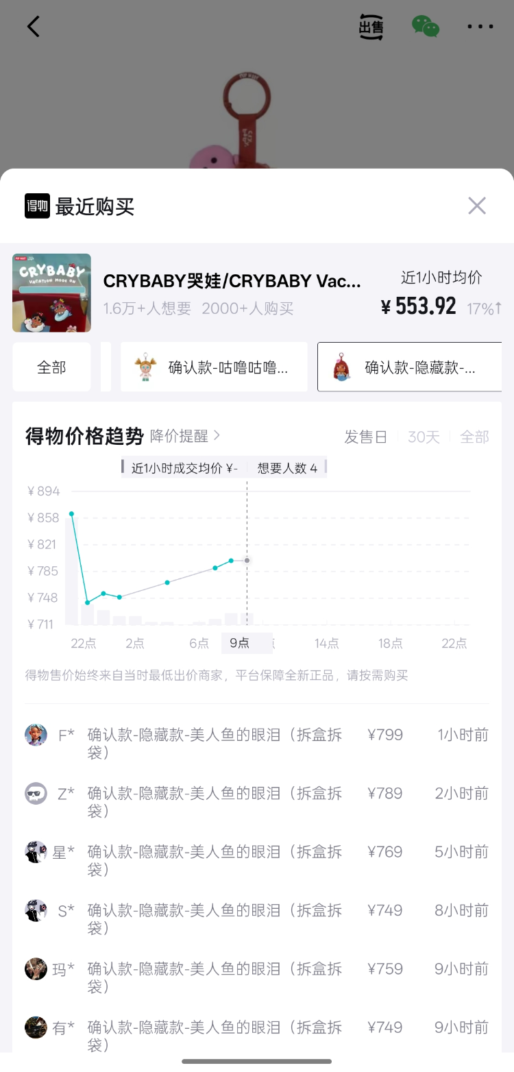 記者梳理(li)發現,這是CRYBABY今(jin)(jin)年推出的(de)(de)第2款(kuan)(kuan)搪(tang)膠系(xi)列盲盒,包含6個常規款(kuan)(kuan)和1個隱(yin)藏款(kuan)(kuan),單(dan)個盲盒129元(yuan)(yuan),整盒價774元(yuan)(yuan)。得物App數據顯示,隱(yin)藏款(kuan)(kuan)“美人魚的(de)(de)眼淚”成(cheng)(cheng)交價從(cong)129元(yuan)(yuan)升(sheng)至(zhi)999元(yuan)(yuan),溢(yi)價6.7倍(bei),弱于(yu)今(jin)(jin)年5月發售(shou)的(de)(de)CRYBABY“豹豹貓貓”系(xi)列搪(tang)膠毛(mao)絨(rong)掛(gua)件(jian),后(hou)者隱(yin)藏款(kuan)(kuan)“豹豹貓貓”發售(shou)后(hou)成(cheng)(cheng)交價由(you)79元(yuan)(yuan)上(shang)漲至(zhi)1186元(yuan)(yuan),溢(yi)價14倍(bei)。今(jin)(jin)年1月,CRYBABY推出了(le)“愛神(shen)的(de)(de)眼淚”系(xi)列搪(tang)膠毛(mao)絨(rong)吊(diao)卡(ka),價格199元(yuan)(yuan)上(shang)漲至(zhi)445元(yuan)(yuan),溢(yi)價1.2倍(bei)。