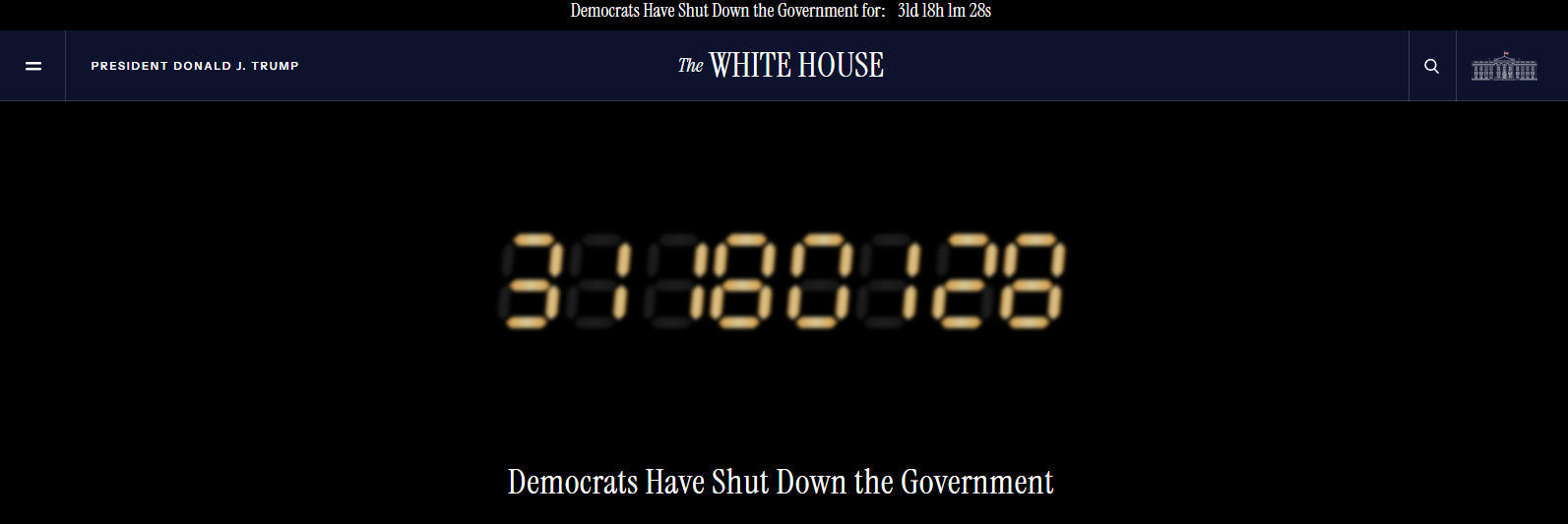 截(jie)至(zhi)美(mei)東時間11月(yue)1日18時(北京時間11月(yue)2日6時),美(mei)國白宮官(guan)網實時刷新紀錄的(de)這(zhe)次美(mei)國政(zheng)府(fu)“停擺”已經(jing)持(chi)續(xu)了31天零18個小時。在白宮官(guan)網的(de)頁面(mian)上,寫有“民主黨人關停了政(zheng)府(fu)”的(de)字樣。