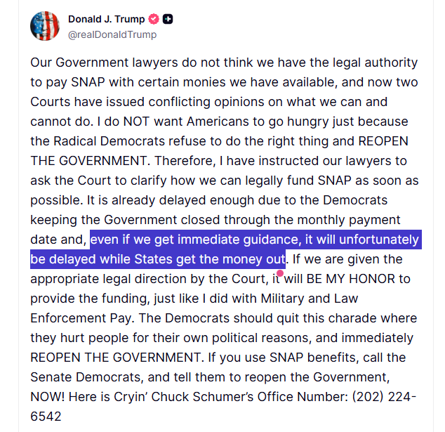 按照特朗普的最新表態,“即便得到了明確的法律指引,各州的資金發放仍然會被推遲”。有美國媒體分析認為,盡管法官作出了恢復“補充營養援助計劃”的裁決,但資金從撥付到具體落地,仍然需要經歷一系列法律與行政流程,因此4200萬美國人的基本食物供應難題可能會從11月開始持續一段時間。