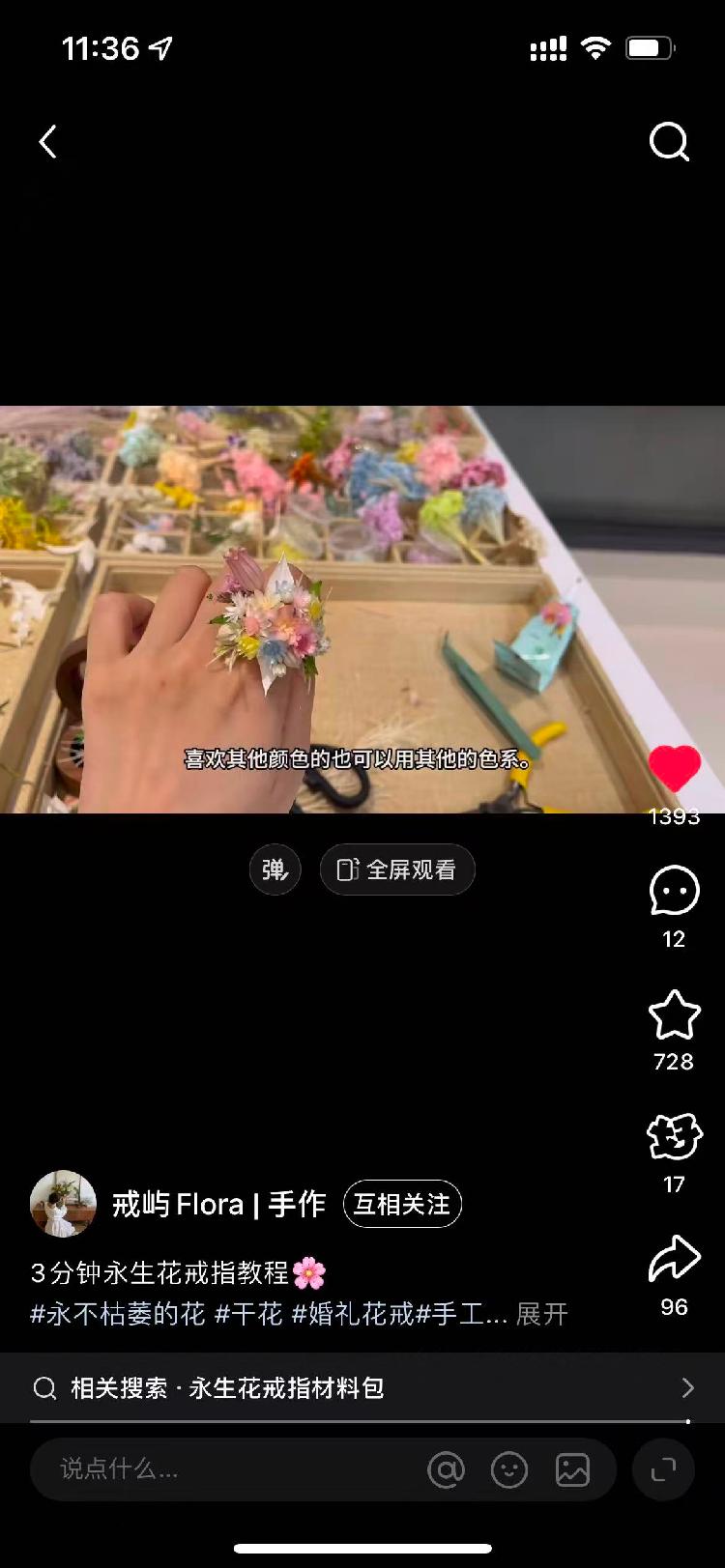 她立刻上1688買了永生花、戒托、膠水、鑷子。第一次做得一塌糊涂,手上全是膠。但她沒有放棄,經過無數次嘗試,終于做出了第一個像樣的花戒。